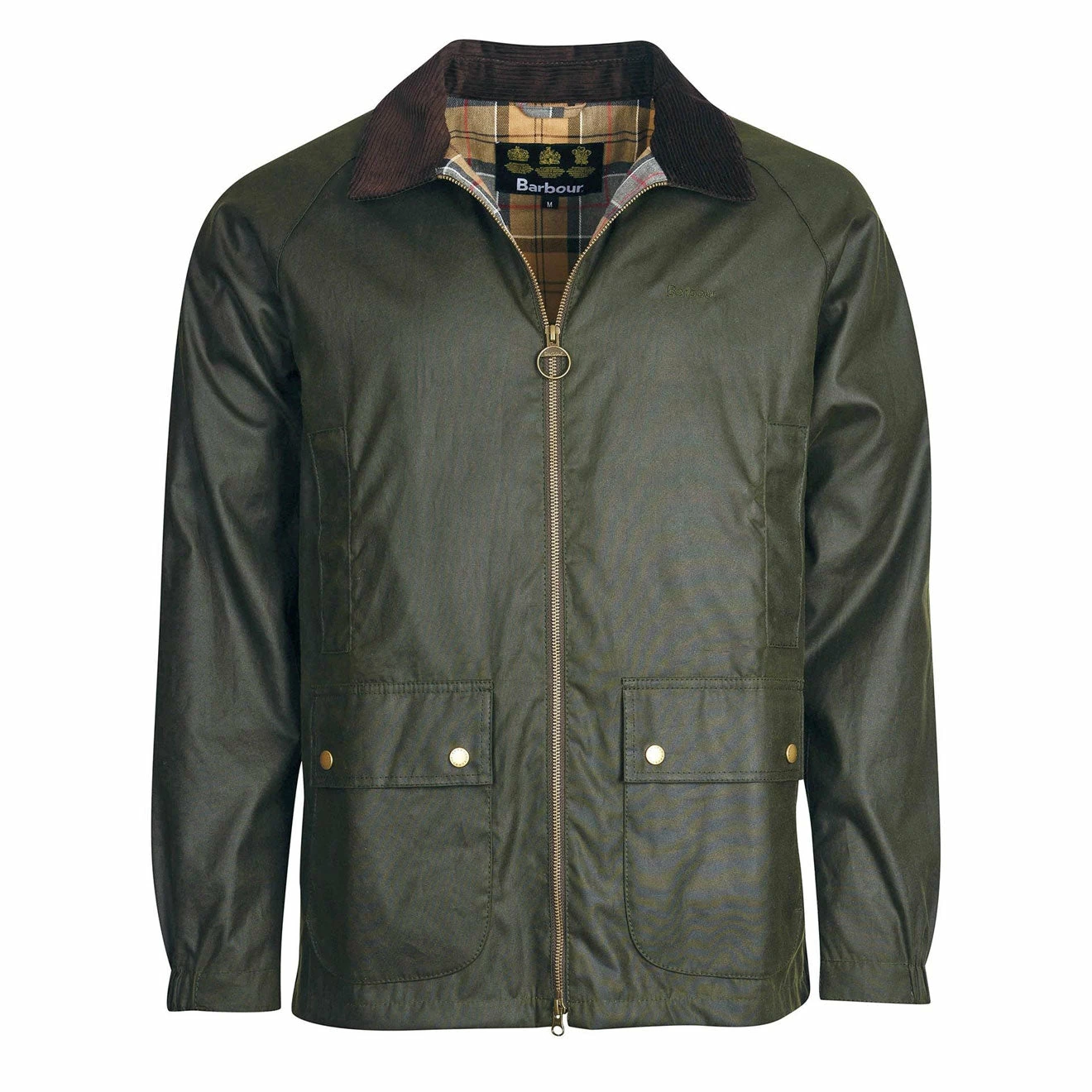 The Barbour Domus Wax Jacket offers a timeless design, with a front zip fastening and a sit-down corduroy collar. It features two lower bellows pockets and tonal embroidered Barbour logo.