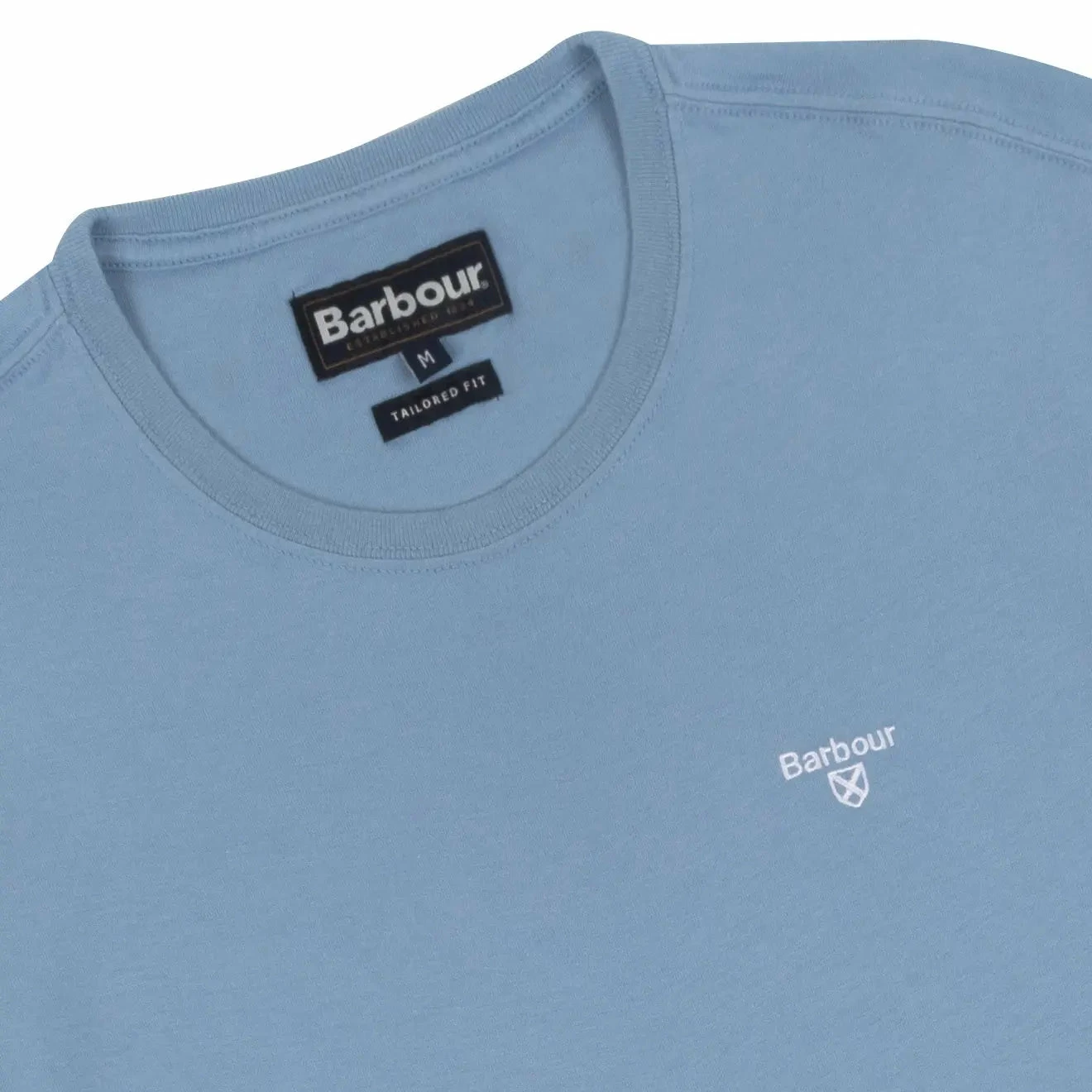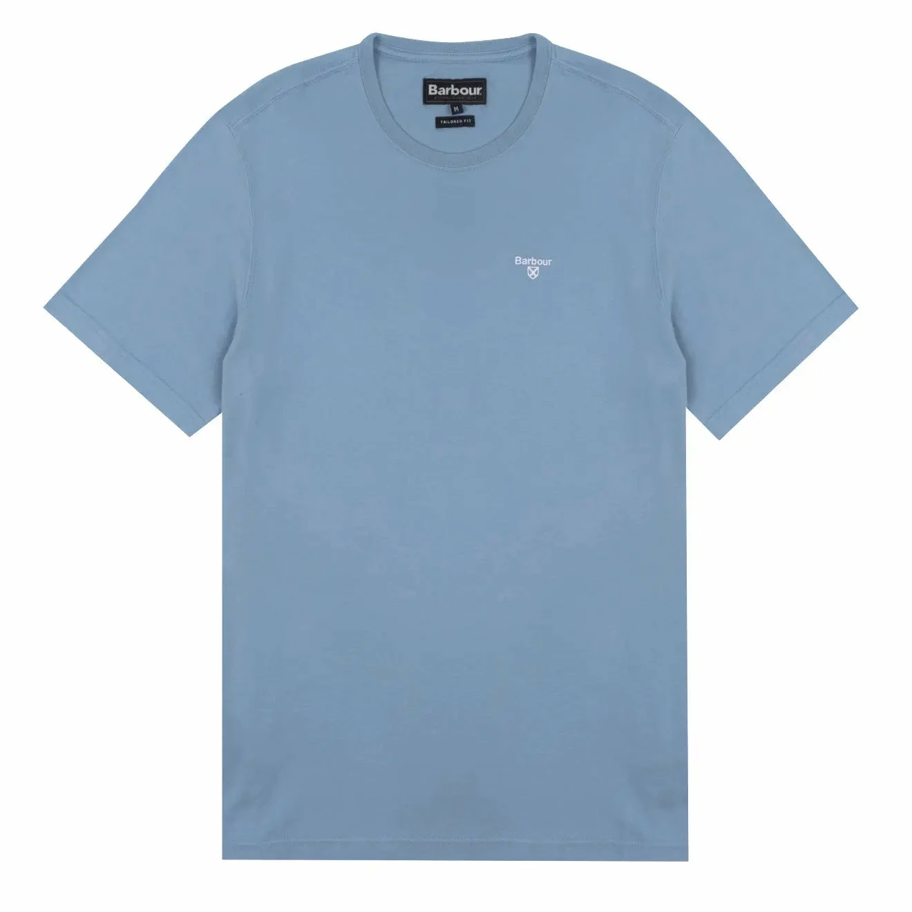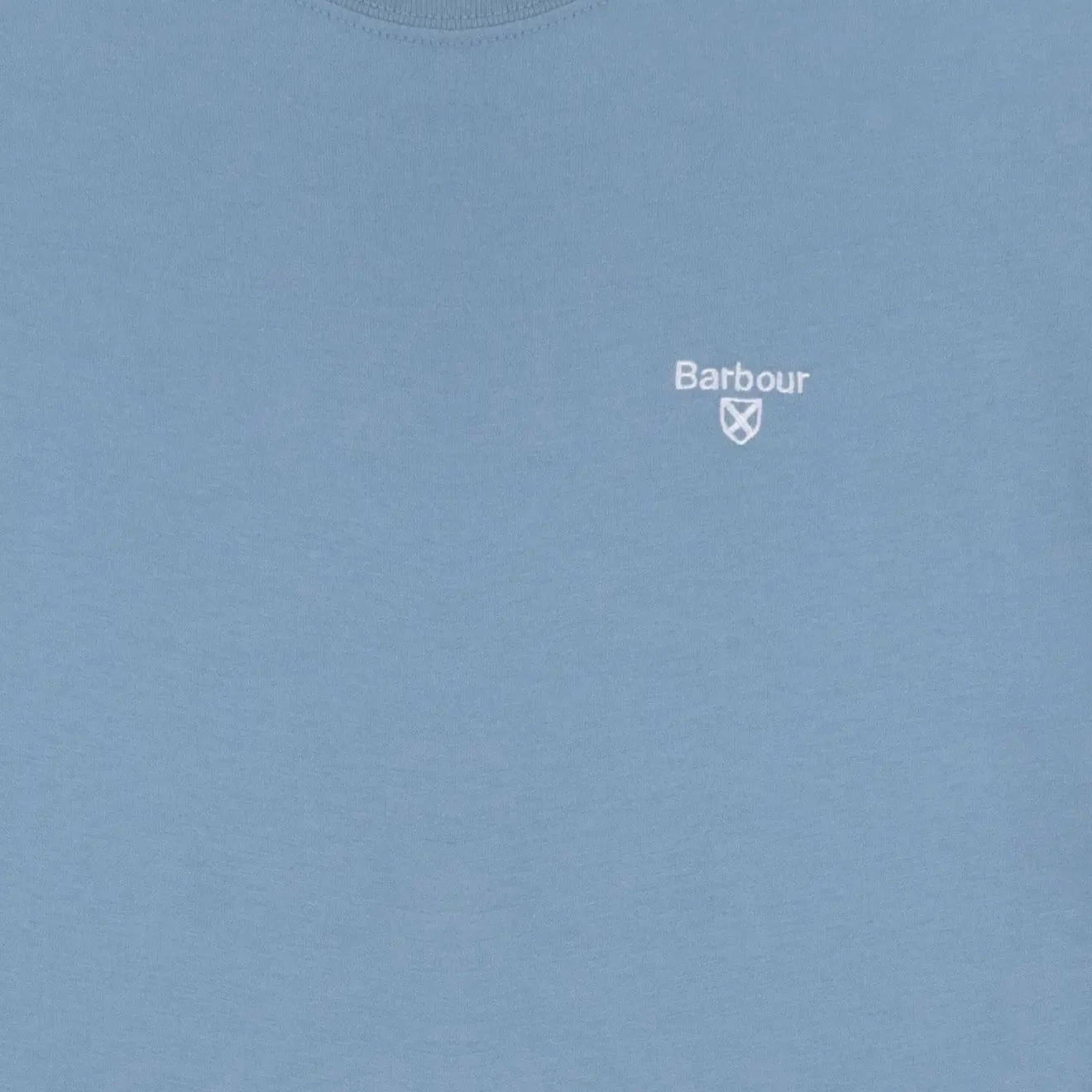 It features a classic finely ribbed crew neck and a straight hem for a timeless look. To the left chest is an embroidered brand logo accompanied by the Barbour name.