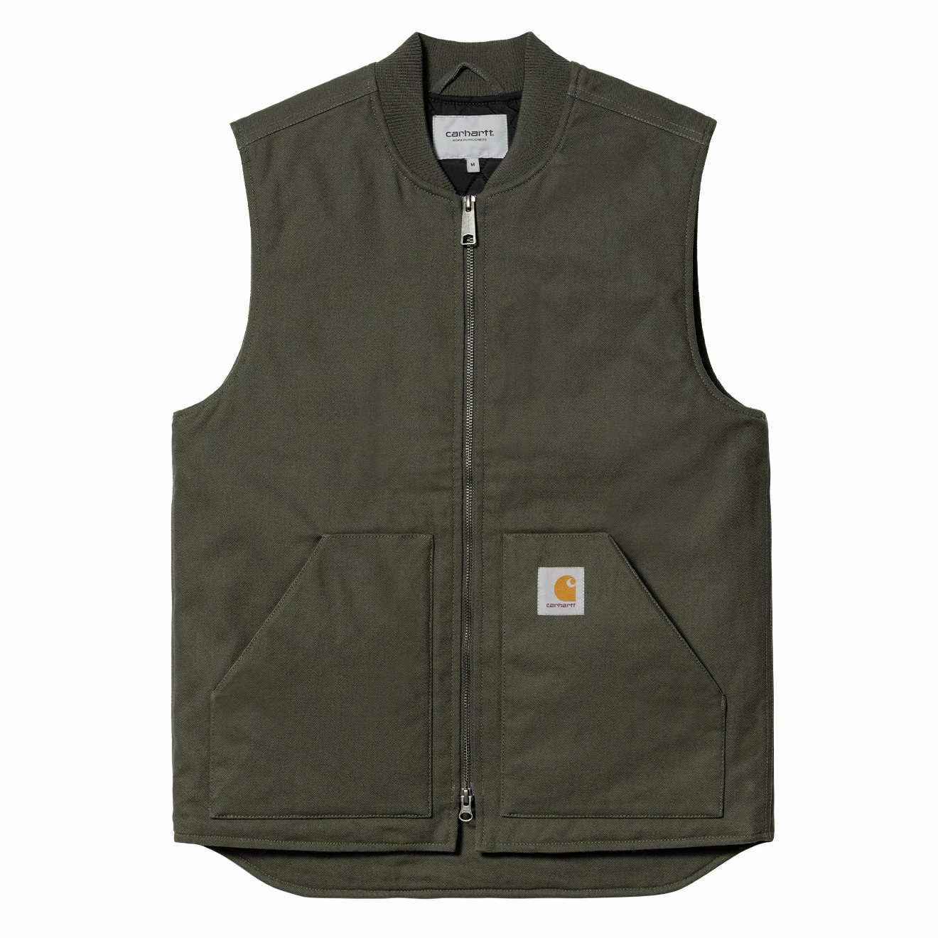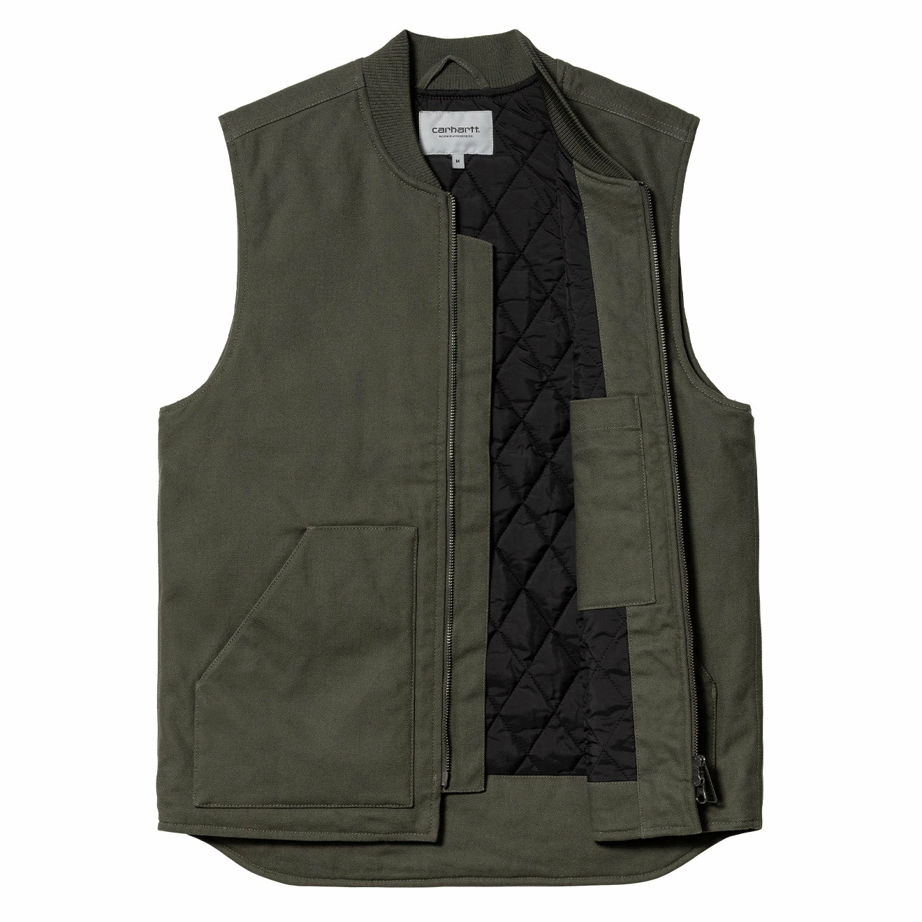 Resonating with the workwear heritage of the brand, the Carhartt Vest Boxwood. Crafted from an hardwearing, dearborn canvas which is cut to a regular fit, diamond quilted and lined with nylon taffeta. Finished with a kangaroo pocket, rib knit collar and front zipper to complete the design.Â