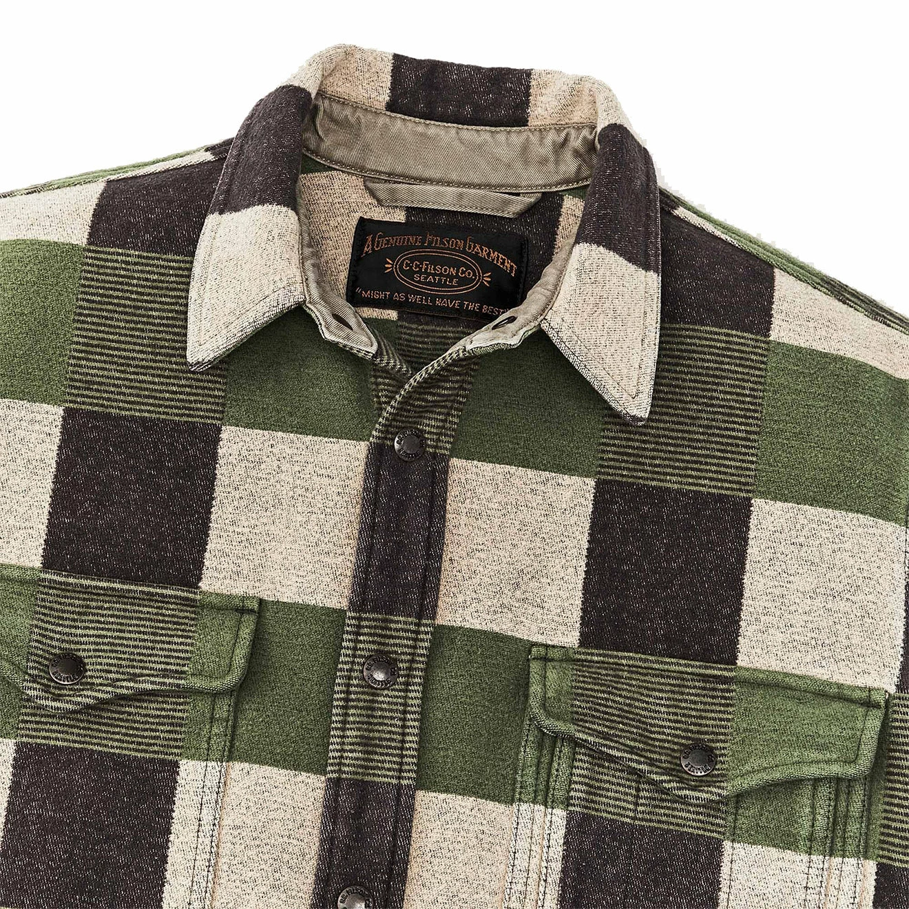 Filsons Beartooth Camp Jacket is made with thick blanket-weight cotton to fend off chilly fall days in the field. The snap-front closure is easy to work while wearing gloves, and its flap-closure chest pockets keep essentials close at hand. Angled-entry handwarmer pockets for added cold weather utility. Garment washed for a well-worn feel on day one.