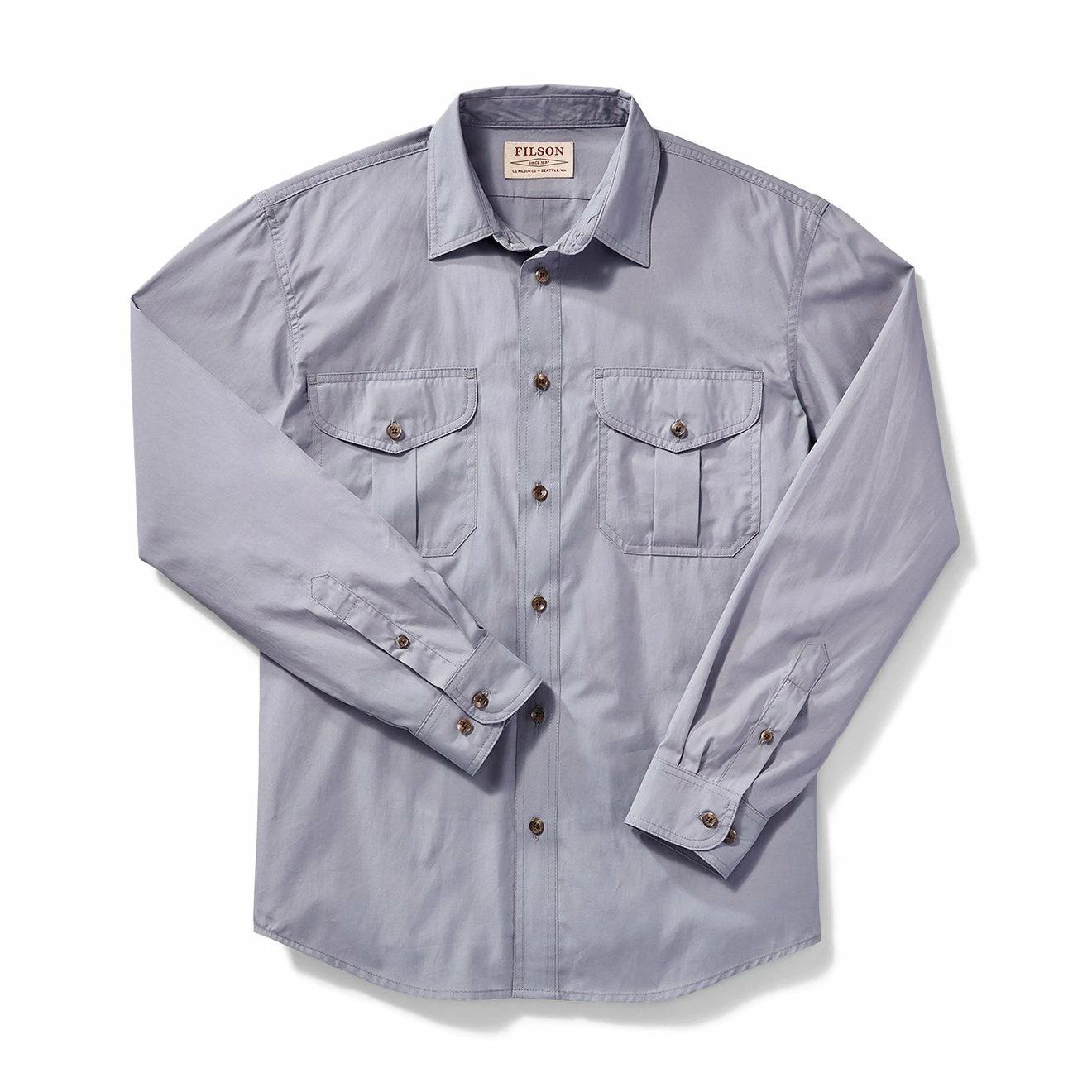 The Filson Feather Cloth Shirt in Smoke Blue is ideal for travelling due to its lightweight and breathable cotton. The material has been pre-washed to help reduce any shrinking. For full movement a pleated back has been designed along with adjustable cuffs. To finish it off a double-needle construction has been added to the seams to improve the durability.