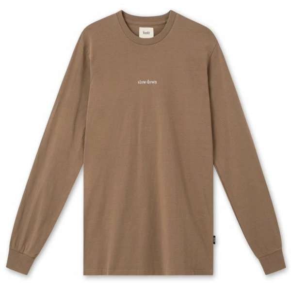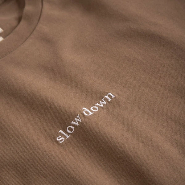 The Forét Down Long Sleeve T-Shirt is a versatile piece for this season. Crafted from 100% organic cotton and embroidered with ‘Slow Down’ on the chest.
