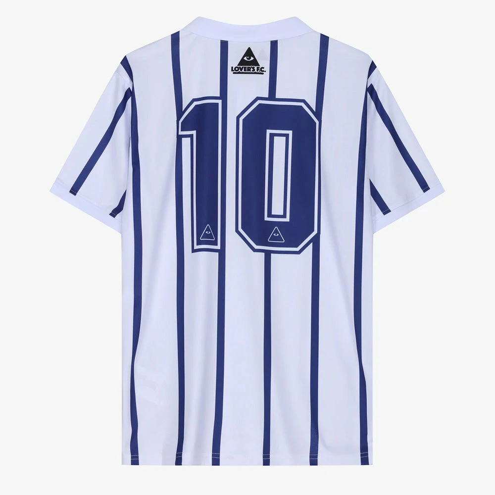 The Lovers FC Footy Shirt features a classic button up collar, short sleeves and a candy stripe print.