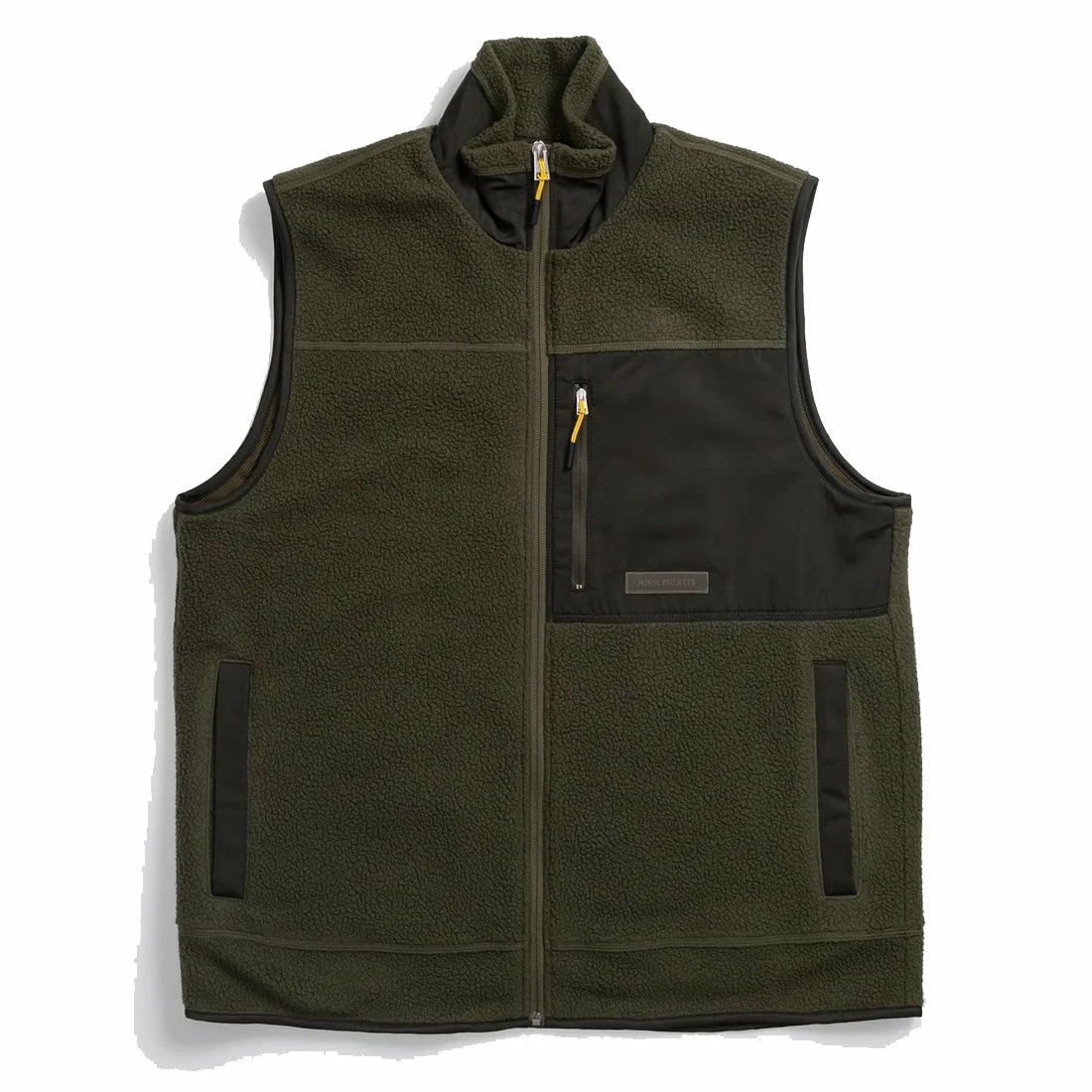 The Norse Projects Frederik Fleece Gilet is constructed using Polartec® Thermal Pro® insulation shearling jersey: a soft fleece with air pockets for thermoregulation and breathability. The details on the gilet include a nylon chest zip pocket with a rubber logo stitched on, pockets on the side and a matching coloured zipper at centre front. The fleece style is mesh lined, has nylon binding at the armholes, hem and is finished with flatlock stitching details.