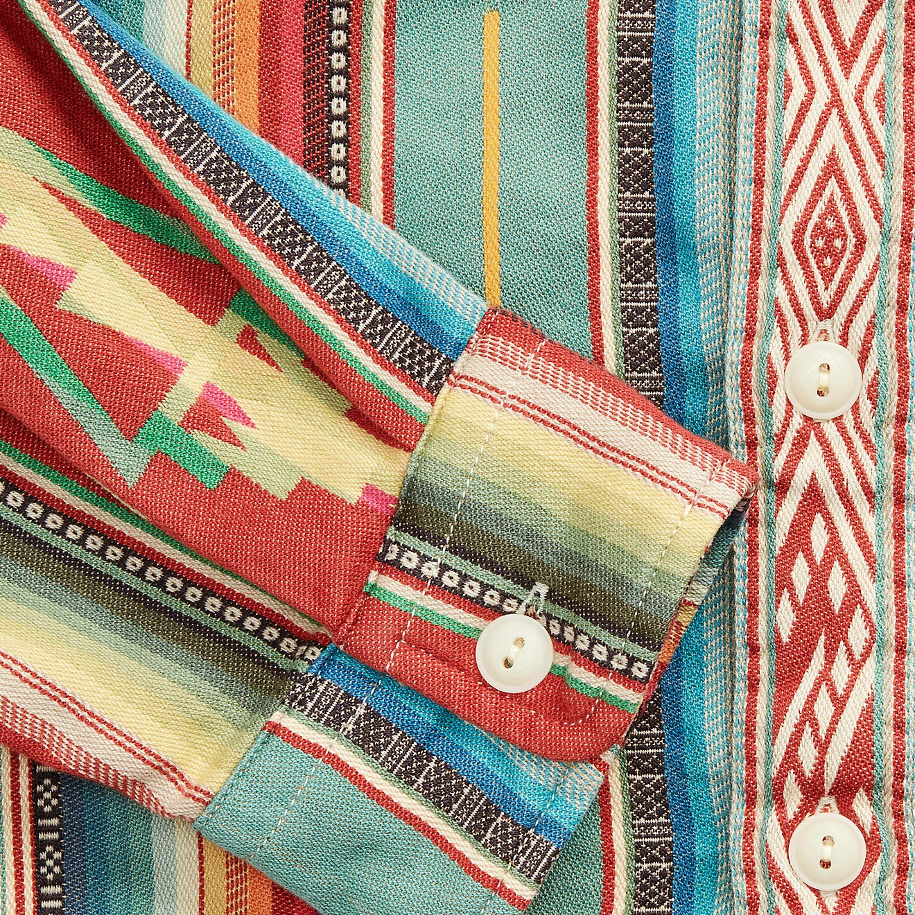 The RRL by Ralph Lauren Jacquard Workshirt is made with lightweight cotton jacquard. Blanket-inspired geometric pattern is developed with 32 different colours. Vintage-inspired buttons. Two chest pockets. Authentic runoff chain-stitched construction on the side seams based on workshirts from the ’20s and ’30s