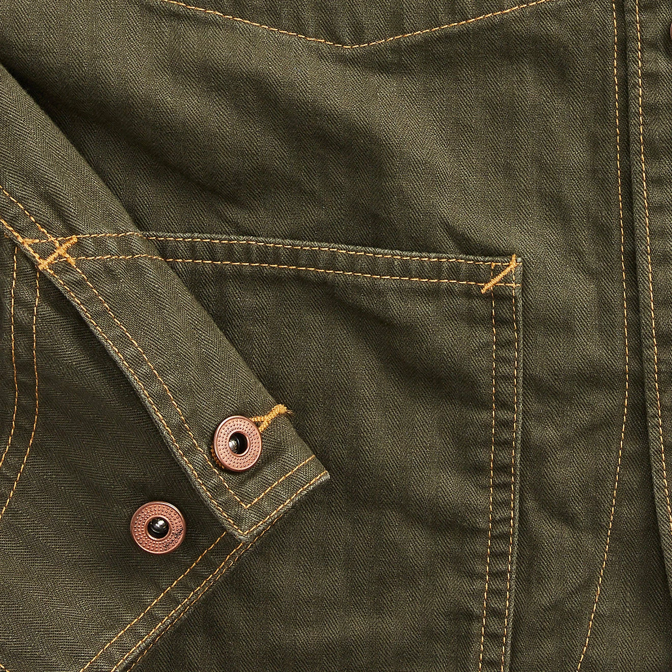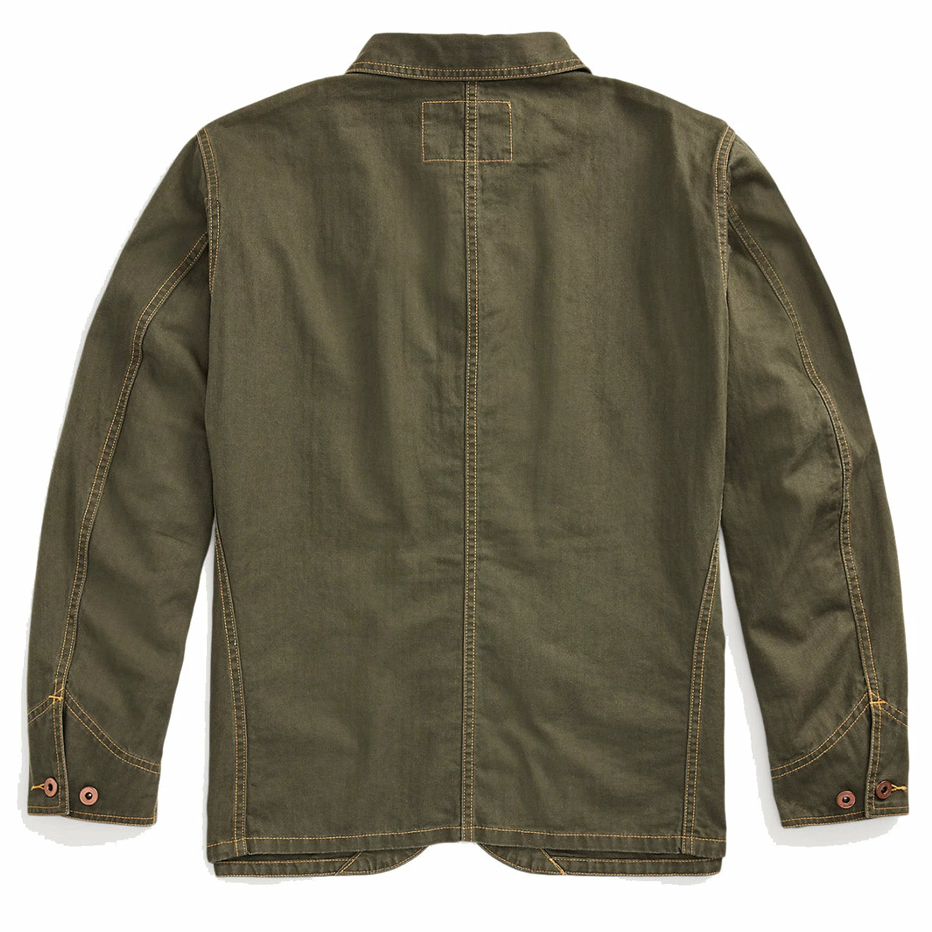 RRL by Ralph Lauren Linen-Cotton Herringbone Jacket is made from Japanese herringbone fabric. Modelled after a classic chore coat. American-made copper-tone metal buttons with a distressed finish. Washed for softness.