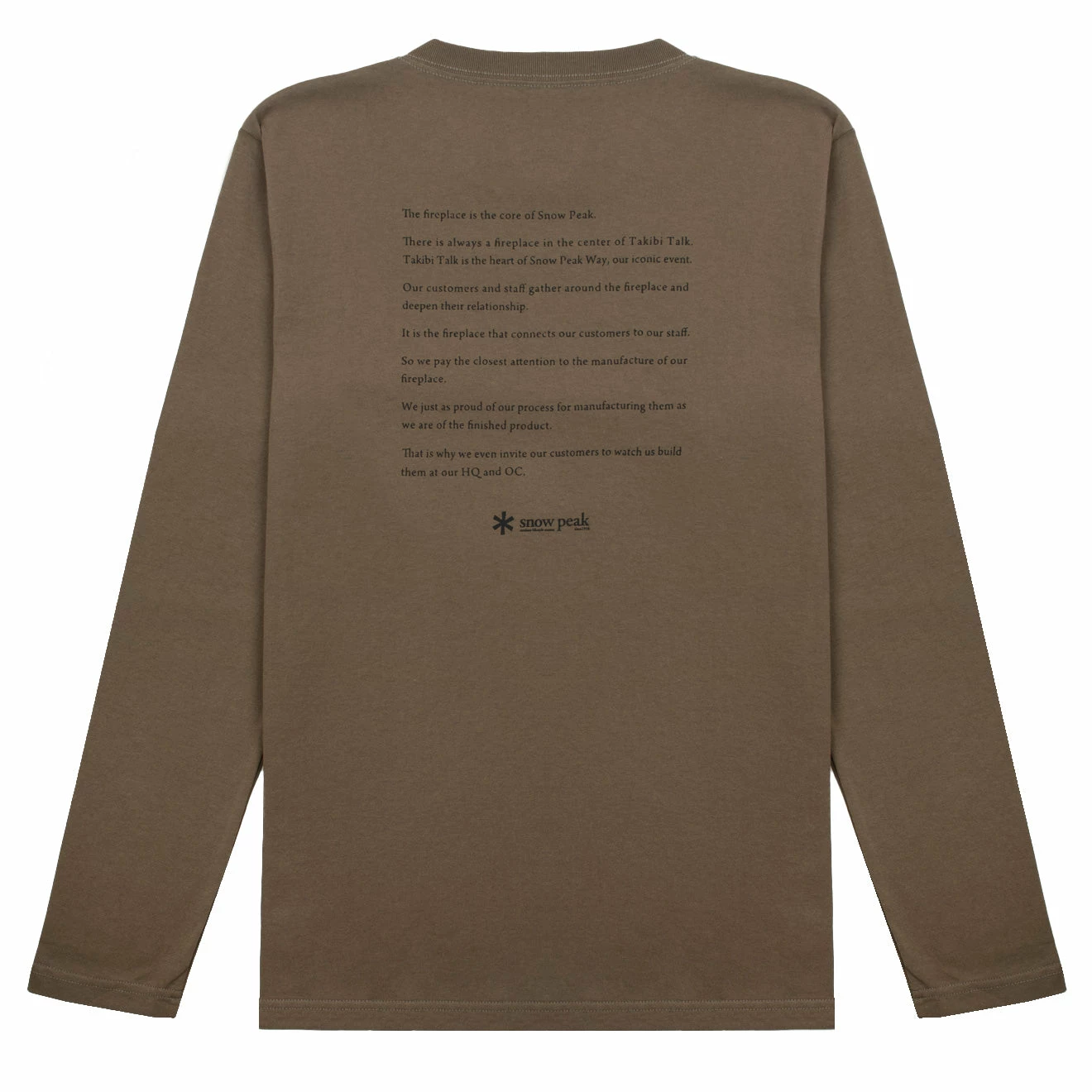 The Fireplace Long Sleeve Tee features a graphic print of Snow Peak’s Pack & Carry Fireplace. A T-Shirt that’s focused on quality, functionality, timeless-durability and considered design.
