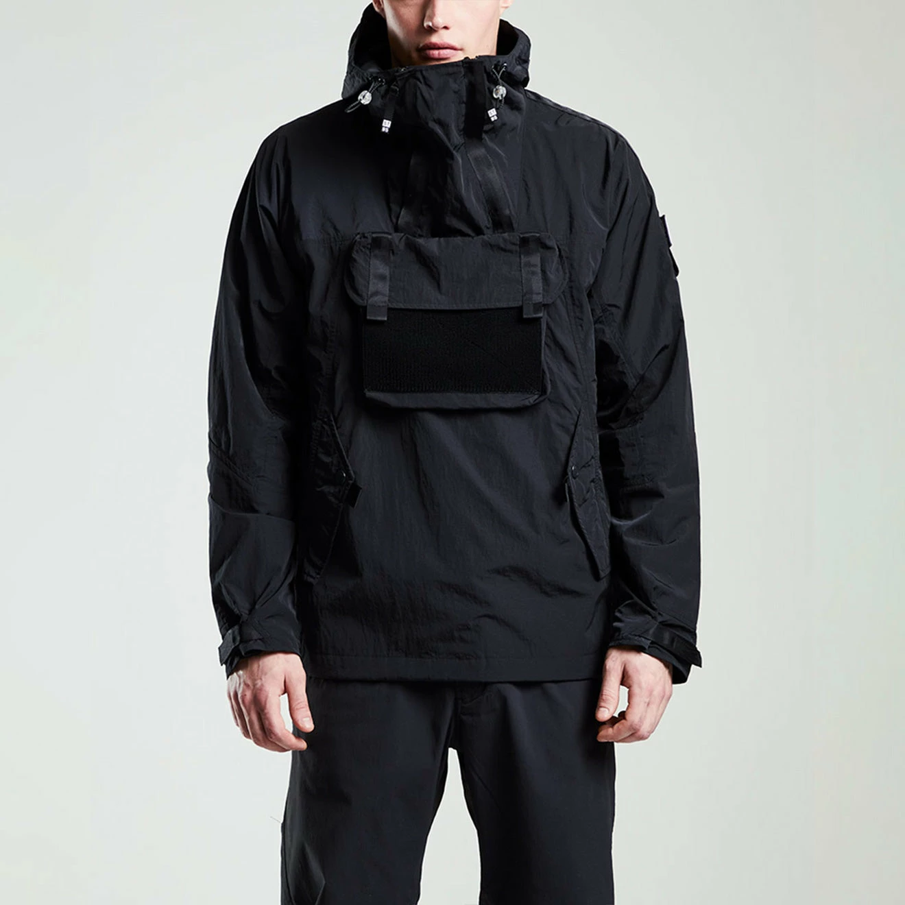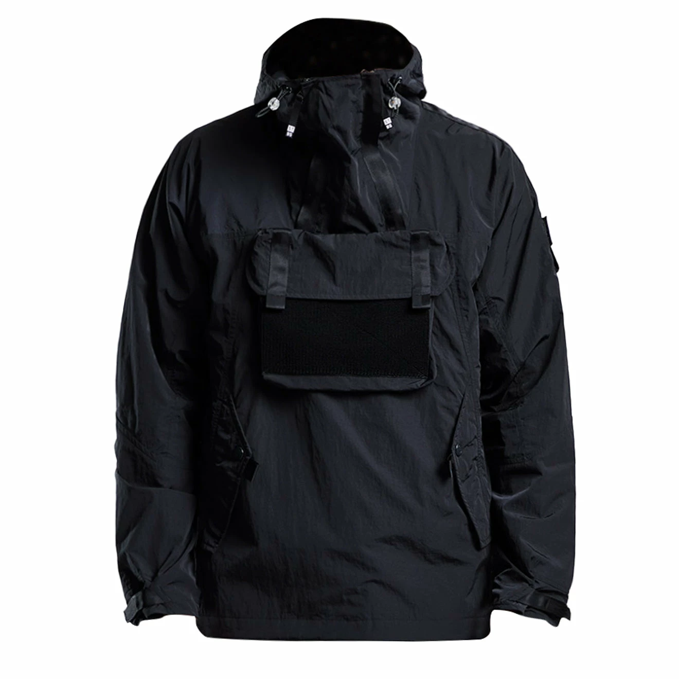 The Drogue Smock is a relaxed fit and has been dyed. Featuring signature shoulder and sleeve webbing detail which incorporates a detachable branded patch to sleeve LHSAW. Featuring a double zip with gusset at collar and zip at side for easy access as well as a boxy chest pocket and kangaroo hand pocket other details are inspired by US Navy Seal Medical Vests.