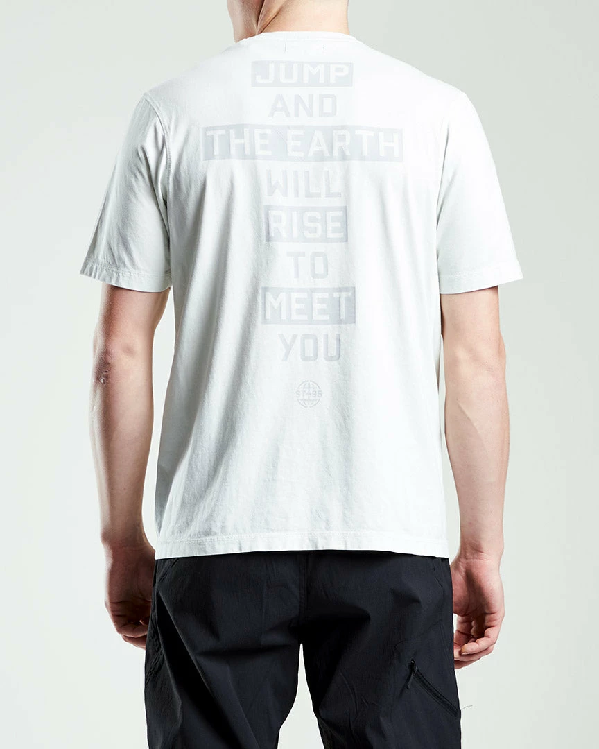 The Jump T-shirt has been garment dyed in a relaxed fit, it is manufactured out of 100% organic cotton. It features a discharge logo print to the left chest and brand statement print on the back
